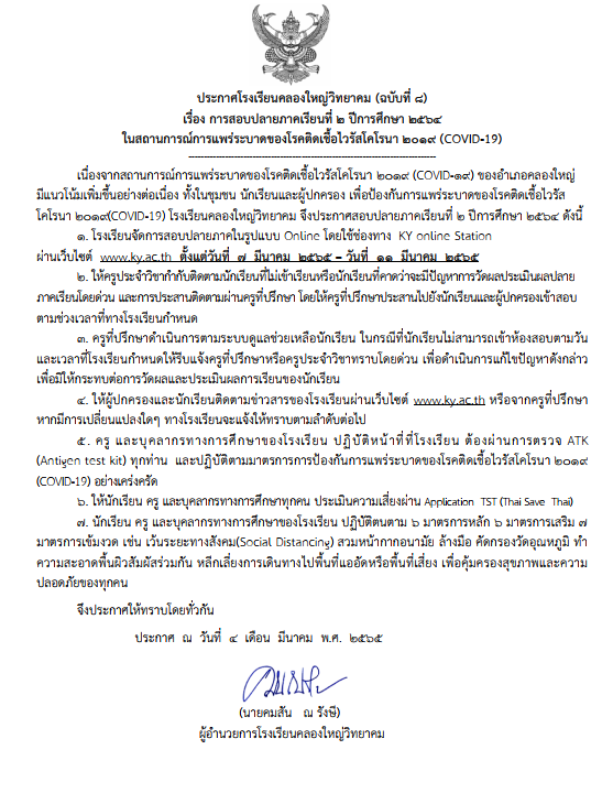 ประกาศปรับเปลี่ยนรูปแบบการสอบปลายภาคเรียนที่ 2 ปีการศึกษา 2565